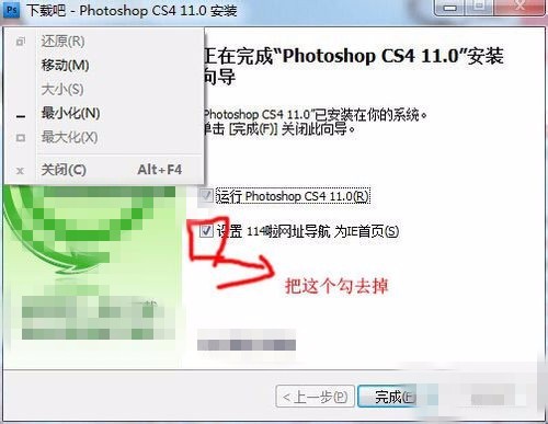 【6】接下来就安装好了,但别把捆绑的软件也安装了,如下图,把其他的勾都去掉,只在Photoshop前面打勾就可以。