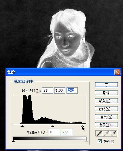 4、对新通道“蓝副本”进行色阶调整,选择“图像→调整→色阶对话框(Ctrl+L)”(图5),黑、白两三角向中间移动,目的是进一步加大对比。