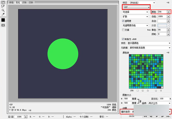 颜色256最高值,仿色的设置对文件的大小影响尤其明显,数值越高,颜色精确度越好(导出的gif质量越好),而文件的大小则越大,因此需要结合实际情况设置数值。其他的参数可以试设置并且对应看下预览信息。