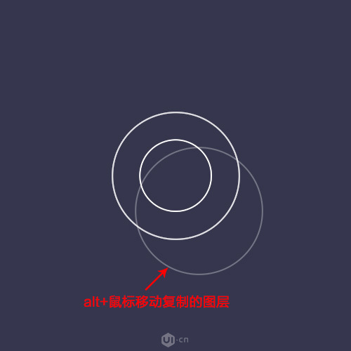 首先分析动画是由圆环从小变大并且慢慢消失,如果我们直接用圆圈减去的方法制作圆环,那么圆环的宽度并不能保持一致,因此采用图层样式的方法,