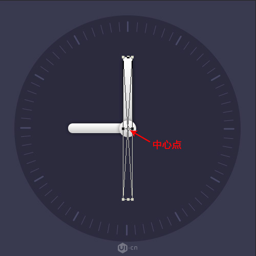 以时钟为例,将指针沿着时钟的中心位置转动起来:用形状工具画一个指针→将其指针转换为智能对象→双击智能对象调整画布的高度/宽度大小200%(参数的设置取决于你想要转换智能对象后的中心点位置),确定再按ctrl+t,我们可以看到中心点还是在中间的位置,只是添加的额外内容隐藏了。