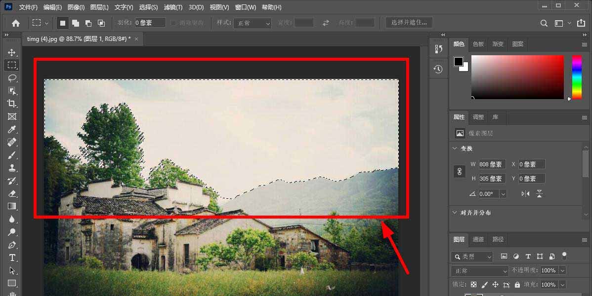 在图片天空区域会自动生成选区。
