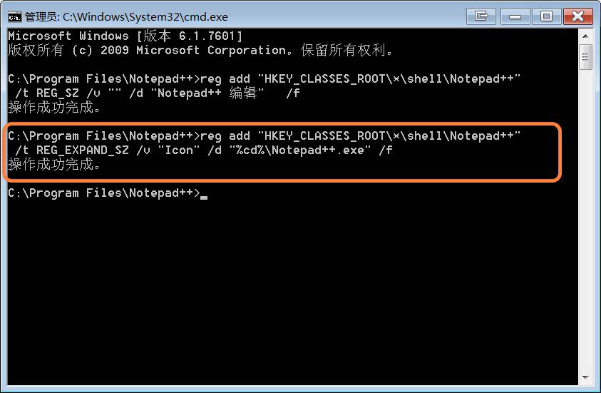输入命令【reg add "hkey_classes_root\*\shell\notepad++" /t reg_expand_sz /v "icon" /d "%cd%\notepad++.exe" /f】并回车执行,给右键菜单添加图标;