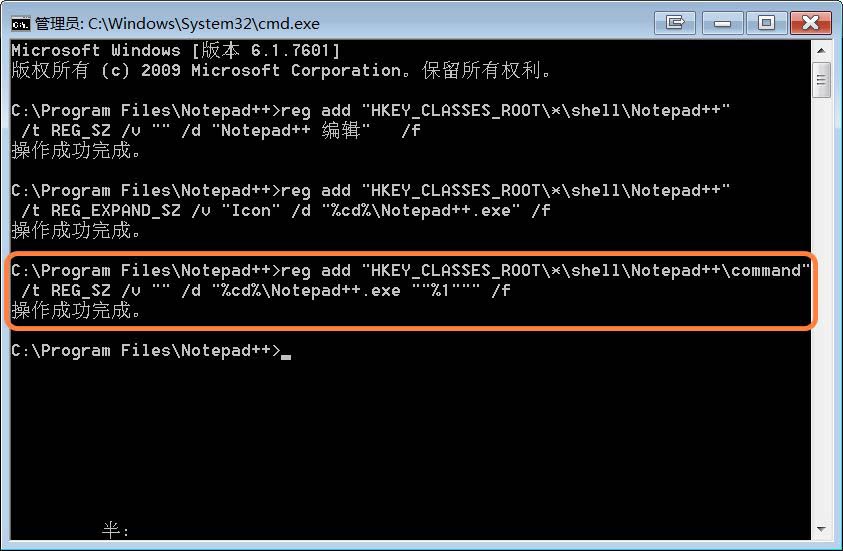 输入命令【reg add "hkey_classes_root\*\shell\notepad++\command" /t reg_sz /v "" /d "%cd%\notepad++.exe ""%1""" /f】将右键菜单关联到文件编辑器上;
