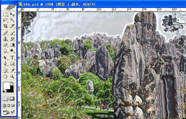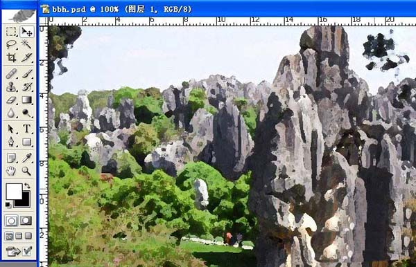 6、在【干画笔】滤镜确定后,可看到风景图片添加上滤镜的效果了,如下图所示。一张图片在用滤镜前,最好复制一个副本在图层中,这样好对比看效果。