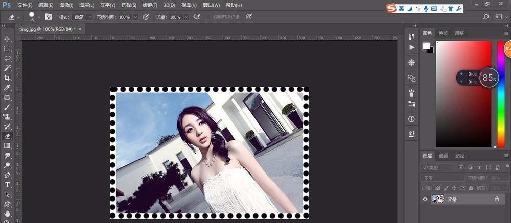 4、使用橡皮擦工具,将背景色调整为黑色,按着shift从左向右拖动,上下左右重复,是不是邮票的感觉就出来了呢
