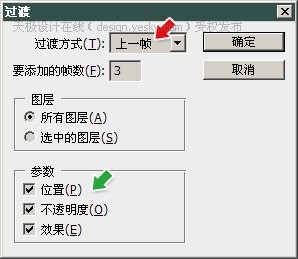 按钮,将出现如下中图所示的对话框,红色箭头处的过渡方式是指过渡相对哪一帧,由于之前我们选择的是第2帧,并且总共也只有2帧,所以既可以选择默认的“上一帧”,也可以选择“第一帧”。要添加的帧数就是指过渡过程所将占用的帧数,这里设为3,那么加上原来2帧,这个动画总共就是5帧。由于只有一个图层(背景层未有变化)在参与动画,所以现在图层选项中任何一个都是可以的。但不选择背景层的话会形成成透明背景,有关动画背景透明的问题我们会在以后学习到。注意绿色箭头处的参数,其中有“位置”和“不透明度”这两项。所谓参数就是指进行动画过渡的图层属性,我们之前说过图层的位置和不透明度的变化可以做成动画,在这里就反映出来了。