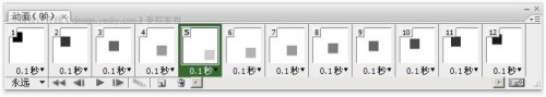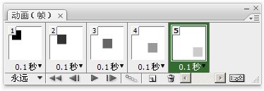 撤销操作到原先只有5帧的时候,现在介绍另外一个简单的方法,那就是选择帧5后再次执行帧过渡,将过渡方式设为“第一帧”,表示是从现在的帧(第5帧)过渡到第1帧去,添加帧数保持为3即可,也可以设定更大的数值。确定后就能得到一个往复式动画了。下图所示是设定了添加7帧的效果。