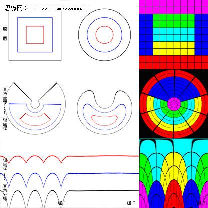 这一组图分别是正方型、圆形和色块通过极坐标变换前后的图像。