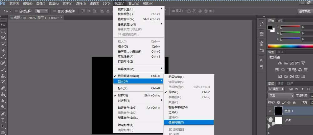 3、此时我们需要看到像素网格。新建一个图层,填充背景色黑色。