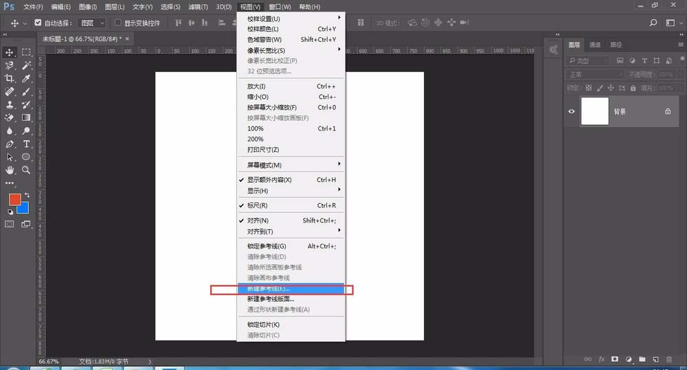 1、打开ps后,新建一个画布,大小只要能够撑得下雪花即可。然后选择视图里面的新建参考线(如图)