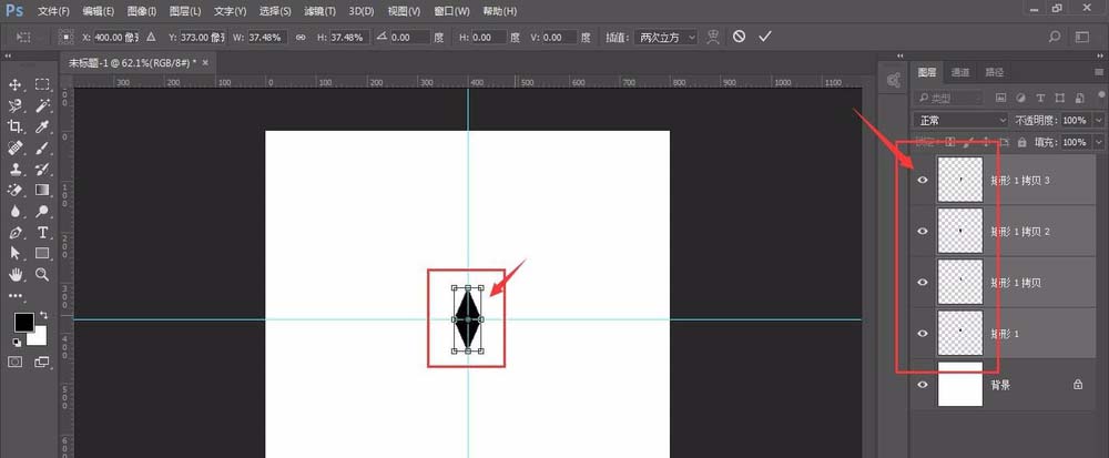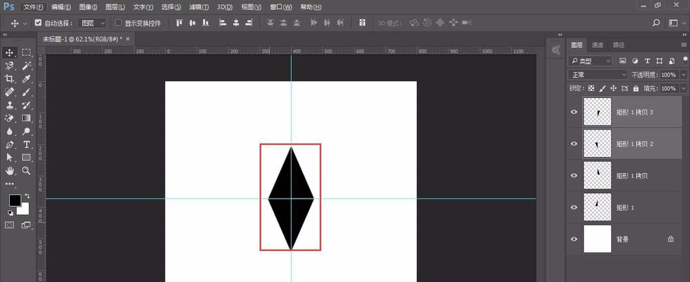 5、然后,以参考线中间为原点,再做3个一样的图形,合并如图所示;如果图形太大可以自由变换后,按住shift键缩小