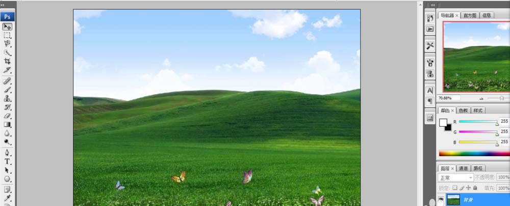 1、在ps软件中打开草地图。尽量选有点雨后晴空的感觉的草地图,即云层有点乌云最好。
