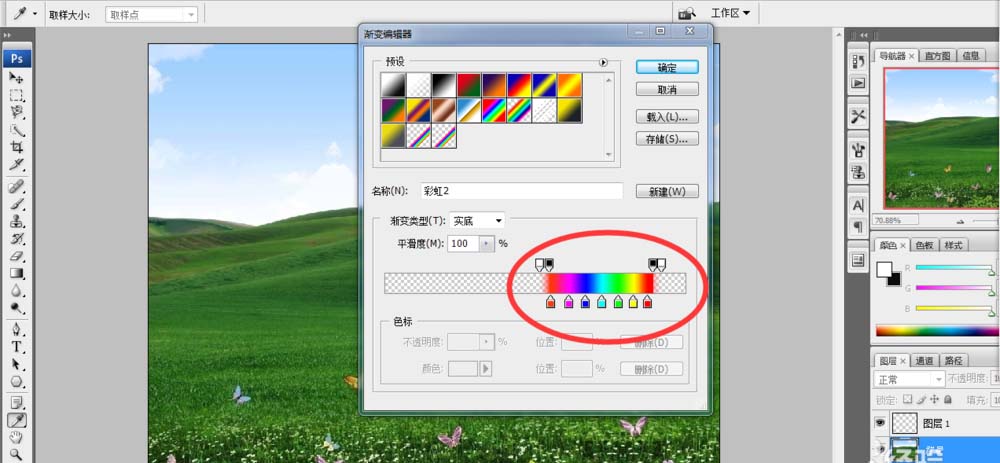 2、点击渐变工具,再选择渐变色彩,选择与彩虹色比较接近的多彩色。