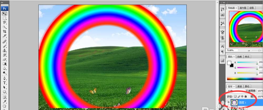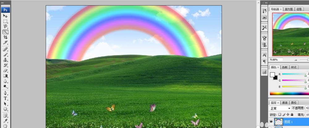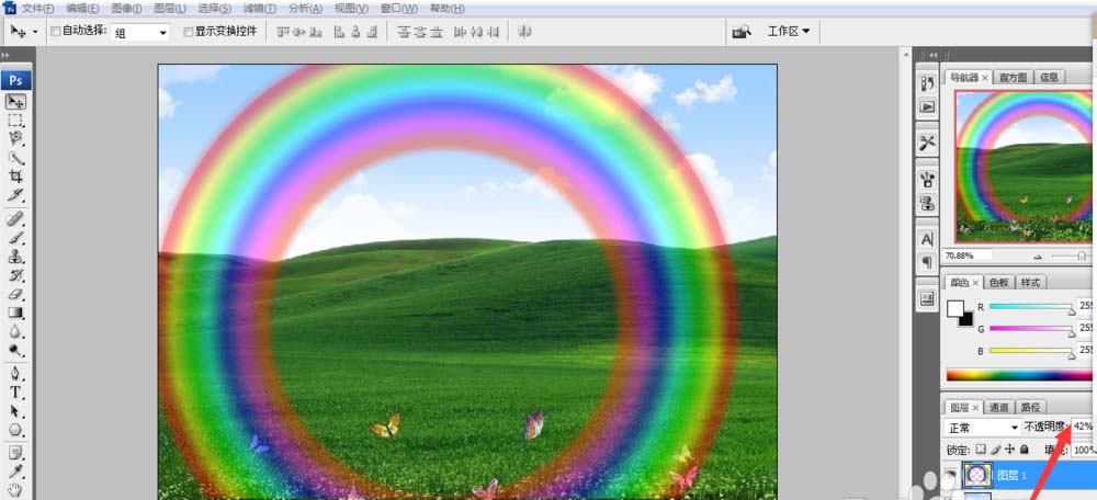 5、彩虹是圆弧的一段,而非环,怎么办呢?将图层1(彩虹图层)的不透明度调低,用磁性套索工具将草地选出来,按delete键删去。
