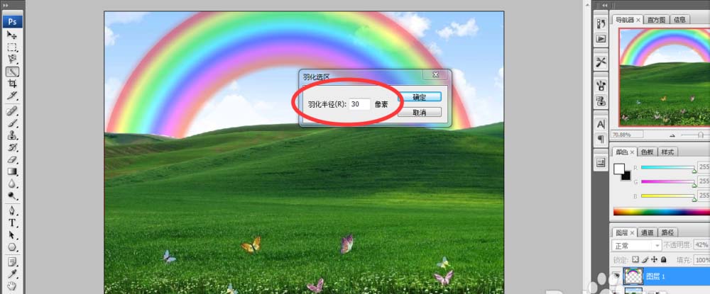 6、这时彩虹看上去有点突兀,又怎么办呢?继续用磁性套索工具选出彩虹,羽化(参数自行设置)。