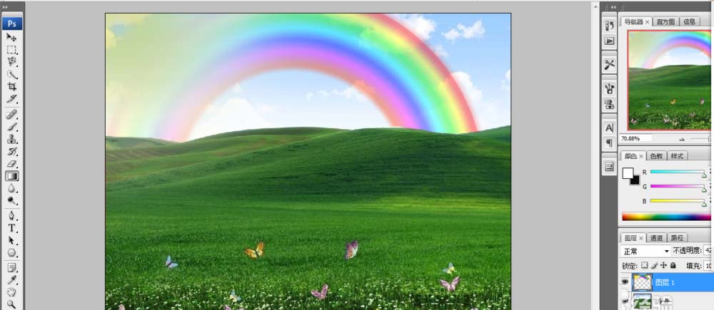 ps的渐变工具在图片处理的很多方面都会用到,如线性渐变处理背景,不清楚线性渐变的朋友们请参考“怎样用ps渐变将白天拍的荷花图p成荷塘月色效果”。这里咱们讨论径向渐变,以草地上p彩虹为例以飨读者。