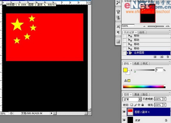 新建一个文件,然后填充为黑色,再新建一个图层,自己用矩形工具以及多边形工具绘制出我们的国旗。