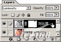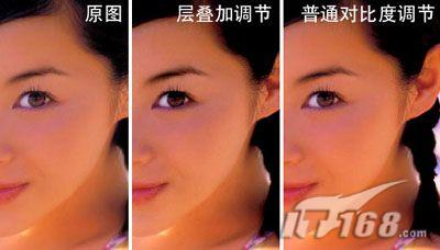 可以明显的看到普通调节法的图象,在肤色与过渡上已经走得很远了。 如果还需要提高图象的对比度,则可以对此明度关系图层进行普通的加"对比度"(菜单image>adjust>brightness/contrast);而需要降低对比度时,可以直接增加透明度,非常方便。