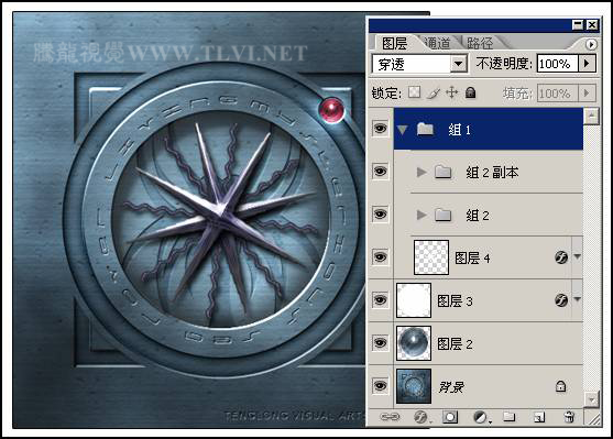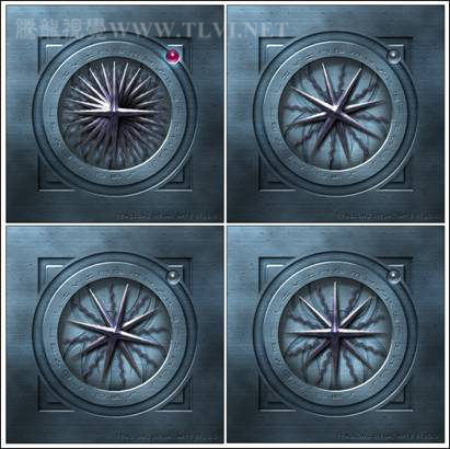 (1)启动photoshop,打开上一章节保存的“罗盘背景.psd”文件。然后再打开本书附带光盘\chapter-10\“旋转指针.psd”文件,使用