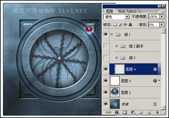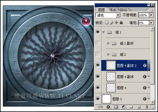 (2)确定第1帧动画为选择状态。在“图层”调板中,将“组 1”图层组中的“组 2”图层组和“组 2 副本”图层组隐藏,然后使“图层 4”成为可编辑图层,如图10-101所示。