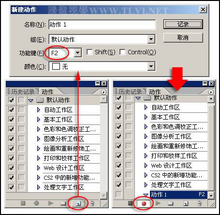 “创建新动作”按钮,如图10-102所示设置弹出的“新建动作”对话框,新建“动作 1”,并设置其“功能键”为f2,然后单击“记录”按钮,开始记录动作。