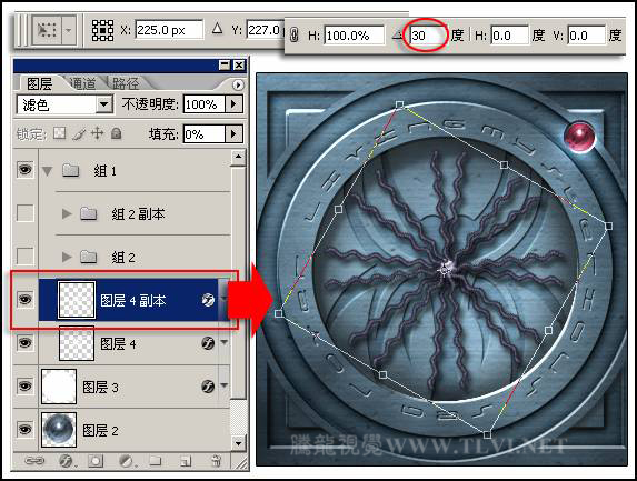 (4)接着在“图层”调板中将“图层 4”复制,创建“图层 4 副本”图层。然后执行“编辑”→“自由变换”命令,将副本图像向顺时针方向旋转30度,如图10-103所示。