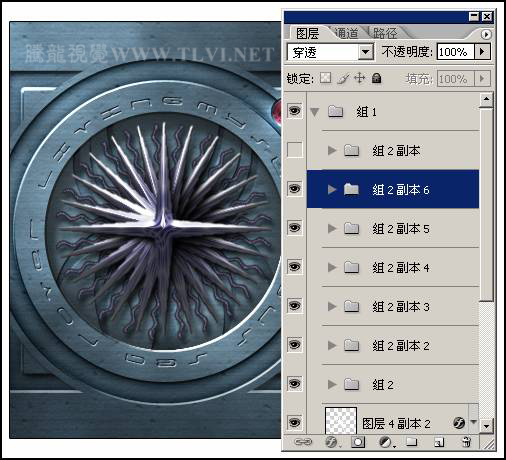 (7)在“图层”调板中显示并选择“组 2”图层组。参照上面设置动作的方法,再新建“动作 2”并开始记录,然后将“组 2”图层组复制,再执行“自由变换”命令,将复制的图像逆时针方向旋转15度,之后停止“动作 2”的记录,如图10-106所示。