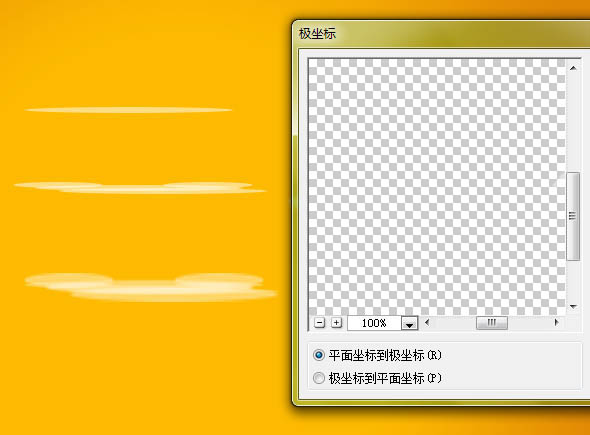 8、做法是先画扁扁的椭圆,不透明度50%左右,多画几个,然后合并图层。也可以将合并后的图层复制后ctrl+t拉高,再合并一次,更丰富。然后,滤镜>扭曲>极坐标。我做了两种不同大小和透明度的弧线。弧线的大小要小于整体的圆。