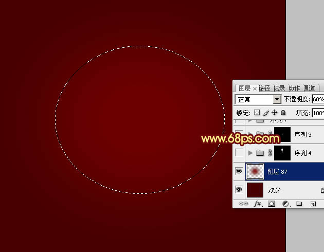 3、新建一个图层,用椭圆选框工具,拉出下图所示的椭圆选区,羽化60个像素后填充暗红色:#850000,确定后把图层不透明度改为:60%,效果如下图。