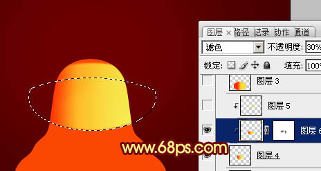 7、用钢笔勾出下图所示的选区,羽化1个像素后按ctrl + j 把选区部分的色块复制到新的图层,混合模式改为“滤色”,不透明度改为:30%,如下图。