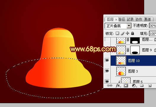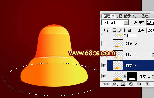 12、用椭圆选框工具拉出下图所示的椭圆选区,按ctrl + j 把选区部分的色块复制到新的图层,混合模式改为“正片叠底”,不透明度改为:20%,效果如下图。