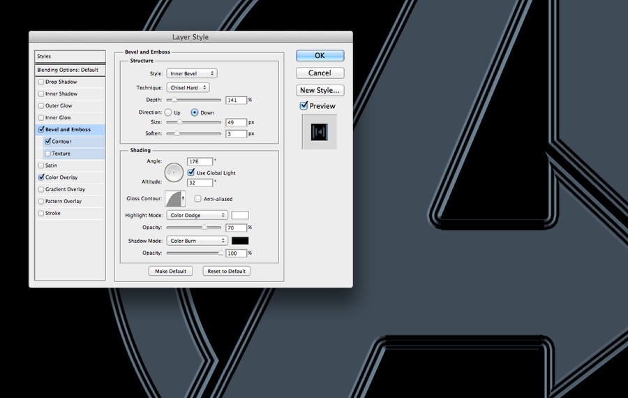 中间版本选择去图层>图层样式>斜面和浮雕。使用内斜的风格,凿硬技术,深度为200%,20像素的大小,3像素的软化。然后材质使用175º角、32º的高度。然后光泽等高线的使用和下面的图片一样。突出模式使用颜色道奇与白色影子模式使用的颜色在80%和颜色烧黑的颜色为70%。