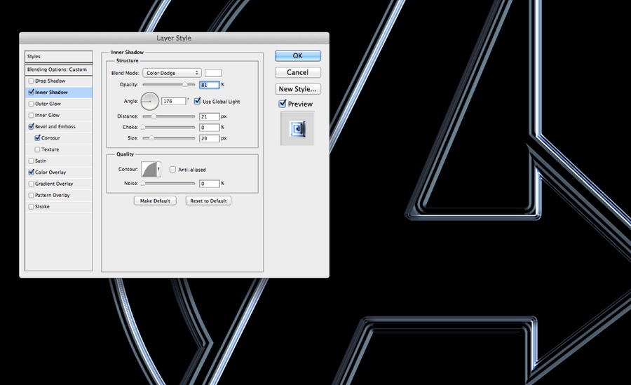 去图层>图层样式>内阴影,然后使用颜色道奇的混合模式和白颜色。不透明度80%,角度使用175%,使用20像素的距离和大小使用30像素。