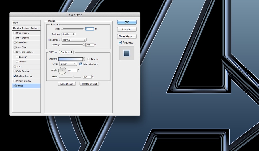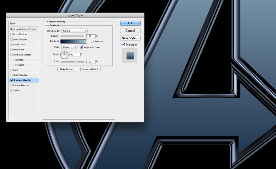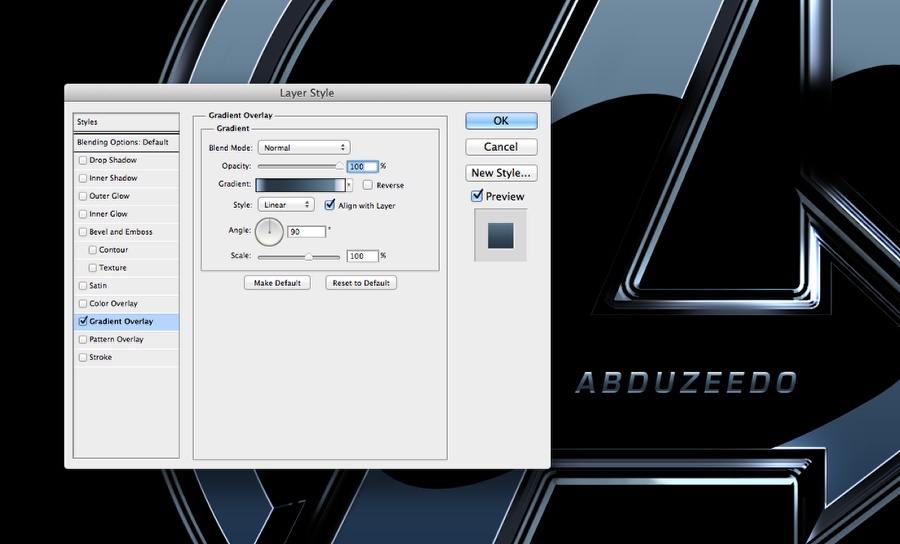使内部符号层可见。然后去图层>图层样式>渐变叠加。使用深色的颜色# 031532和# a4c2d6打火机。