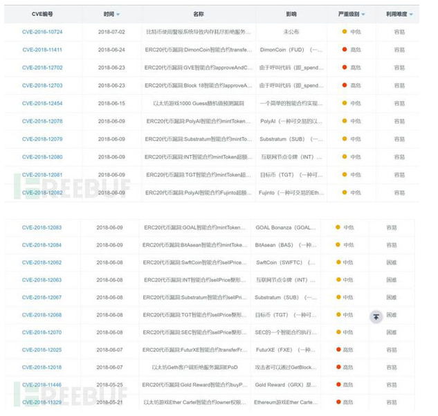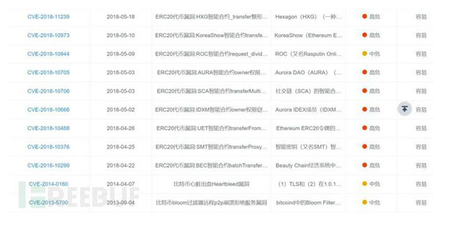 下图是部分基于以太坊ERC-20智能合约标准开发的代币合约的漏洞信息: