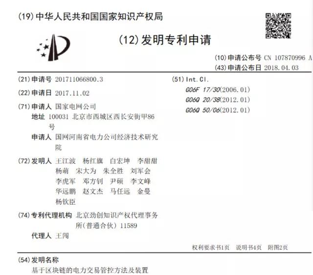 去年11月,国家电网向中国国家知识产权局提交了一项名为“关于区块链的电力交易管控方法及装置”的专利申请。4月3日,这项申请正式对外公布。