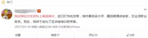 非专业背景也能当讲师?这种情况目前十分普遍。粗略统计微博上关于区块链培训的广告,发现所有讲师中约有七成无区块链或计算机领域专业背景,或者干脆是XX财经创始人、XXCEO、XX币爱好者或持有人。