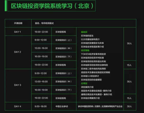其中,据猎云网整理,区块链投资学院(BIA)发布的第1期课程,培训时间为3天2夜,每人88888元,后续将逐渐上调。