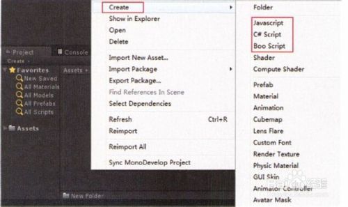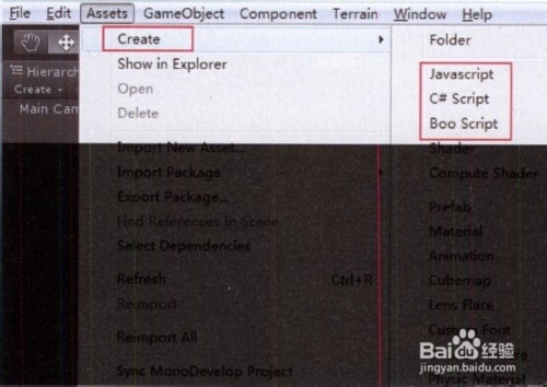 1、Unity支持三种汇编语言,分别是JS、c#和Boo。创建脚本的方法主要有三种,首先启动Unity,单机菜单栏中的Assets->Create来添加脚本。