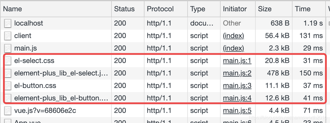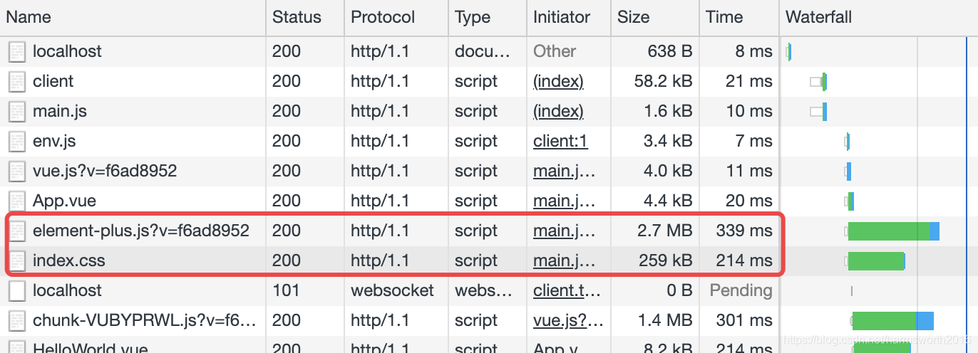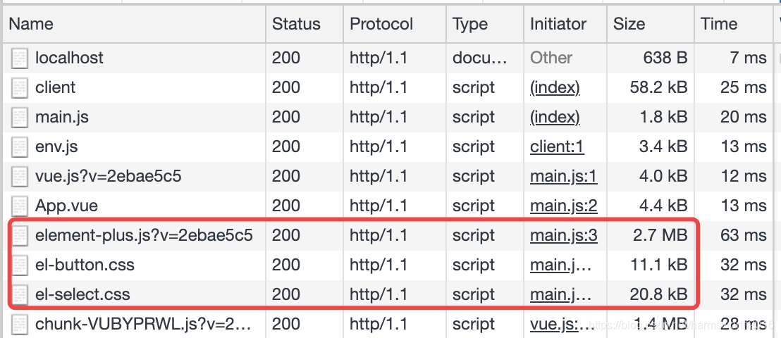 可以看出 element plus 的 js 和 css 文件大小和耗时都挺大。