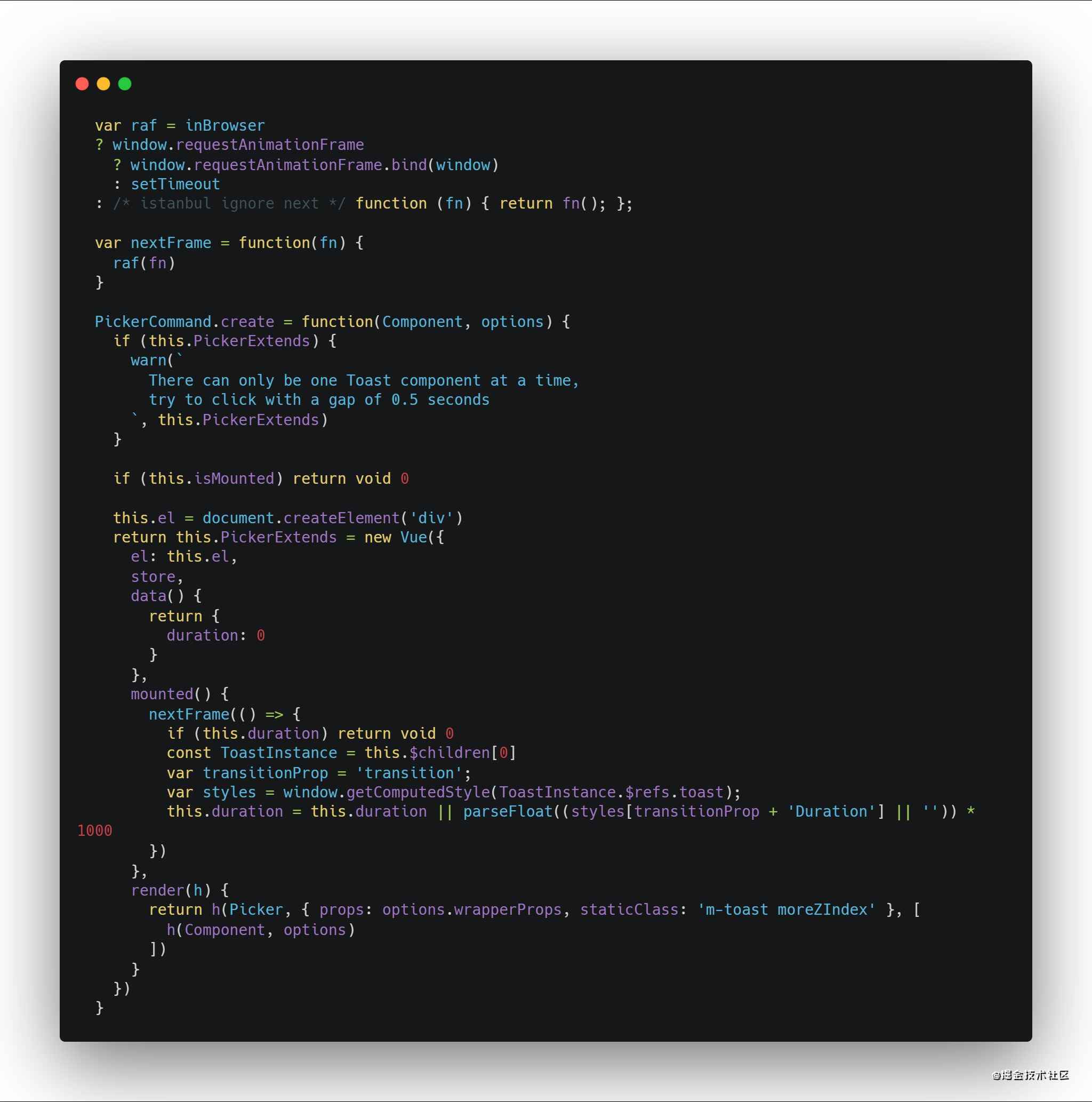 toast组件mounted -> 父组件mounted(也就是现在所处的mounted函数, 注意此时因为toast里的transition没有携带appear属性,导致transition enter函数不会触发,从而transition class不会被添加) -> nexttick() -> toast组件update(v-show) -> transition(v-show触发enter函数) -> toast dom增加了transition类名 -> window.getcomputedstyle(toast)获取toastduration,我们也可以在nexttick里获取,介于transition active在动画全过程都会有,并且requestanimationframe属于浏览器重绘(painter)钩子函数,比微任务还要靠后执行,所以在这里获取