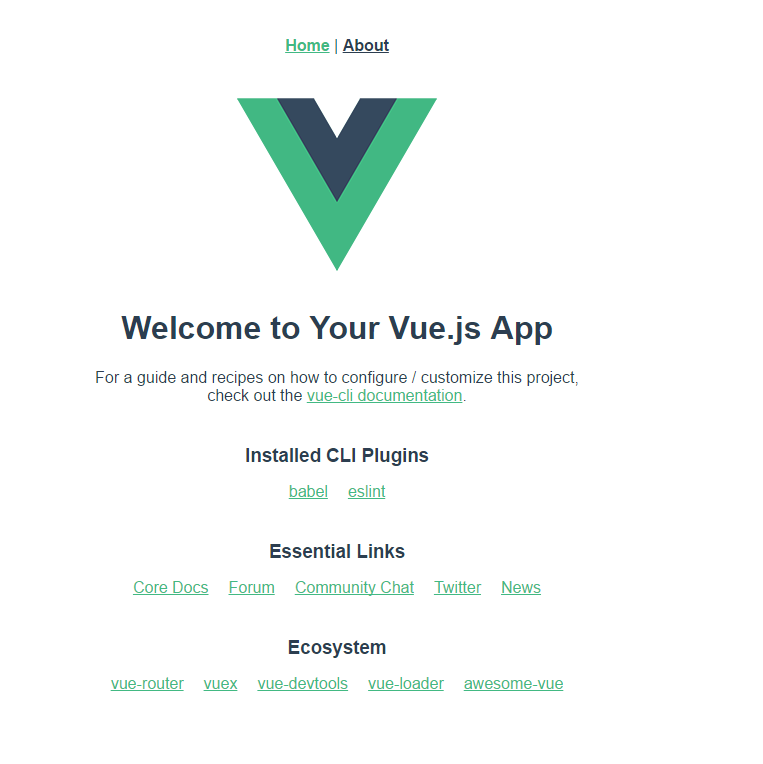 接下来按照上面的提示运行 cd app以及启动本地服务器 npm run serve,当运行完成之后会提示你打来本地端口 http://localhost:8080,会出现欢迎页面,此时代表你的vue项目初始化完成。