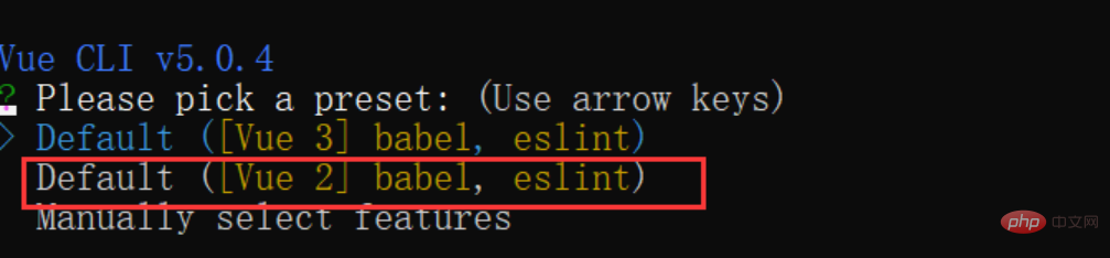 3.使用vue create 项目名称 创建项目,成功后会有一个vue版本的选择(按键盘的下箭头即可切换),这里我们选的是Vue2