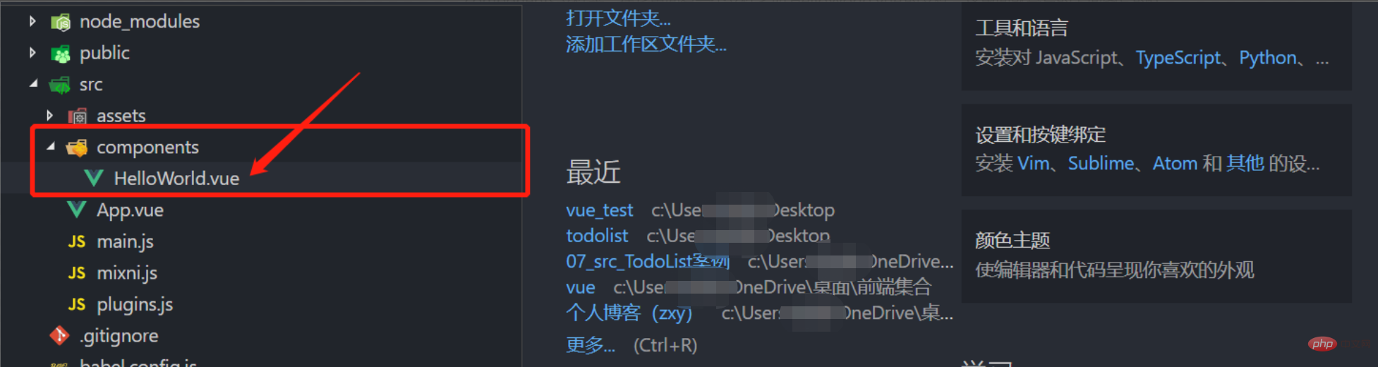 5.可以直接搜刚才所创建的文件,然后直接拖入vscode(有下面这些文件)我们可以找到src下面的components文件夹,在它里面有一个文件名叫HelloWorld.vue的文件,这里面就是写的上面图片的代码