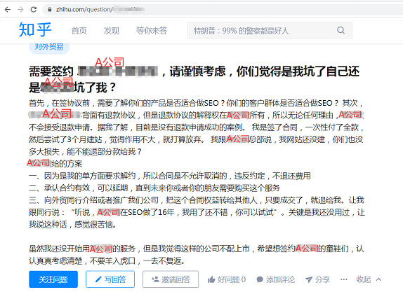 据我了解的 A 公司的做法是:合作收款后,先做网站,网站做完后,A 公司说开始做 SEO 优化了,100 个长尾关键词就陆陆续续排到 Google 首页了,但就是没有什么反馈询盘,然后到了 1 年快结束和续约前 1-2 个月左右,A 公司会偷偷地花 1-2 千元,投一下谷歌 SEM 广告,于是用户就看到反馈询盘了,这时候,A 公司的代理商就跑上去,告诉用户,做 SEO优化,是需要时间的,你看,现在效果出来了,但续约时间到了,你赶快续约,不续约的话,就前功尽弃了,用户一看反馈确实有了,虽然订单还没有,但总得需要时间吧,于是又付了 39800 元,只要用户一付钱,马上反馈询盘就没了,因为A 公司停止了谷歌 SEM 广告,很多用户都要被骗 2 年才明白其中的“大坑”!
