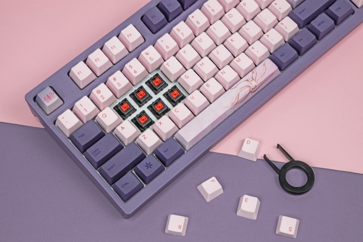 选用高含量PBT材质注塑而成,微颗粒粗糙处理。触感细腻舒适,材质经久耐用。手感佳,不留指纹不打油。表面经过热升华处理,字体清晰。键帽顶部的凹陷设计也让指尖的贴合度更好。