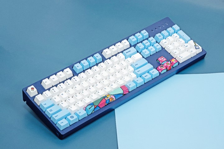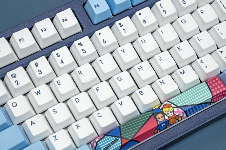 键盘整体蓝色为主,有一股海洋的气息,搭配海尔兄弟的元素显得更加和谐。白色和蓝色的键帽搭配简约而又不失大方,键帽的材质为高含量PBT材质,整体采用正刻字体,所以不必担心长时间使用所造成的打油问题,同时PBT的键帽也节约了用户日后打理和保养的时间。