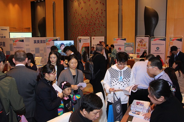 除了一系列精彩演讲,在学校展厅内还汇集了广州众多国际学校校长或招生官,现场跟学生及家长面对面交流。参展的国际学校有华南师范大学附属中学国际部、广州市西关外国语学校国际部、佛山外国语学校国际部、广州二十一中国际部、广州市香江中学国际部,比较火爆的广东碧桂园学校、广州华美国际中学、中黄国际教育(中大附外、中黄世界书院美国GIA高中)、中信山语湖双语国际学校、广州爱莎国际学校、梅沙黑利伯瑞书院、佛山市北外附校三水外国语学校、英国卡迪夫中学等国际学校,只招收外籍人员子女的广州南方外籍人员子女学校等。
