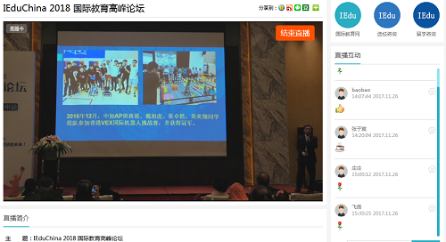 “IEduChina 2018国际教育高峰论坛”为满足不同人群的多样化参展需求,开展“线上+线下”相结合的举办方式。学生和家长不但能直接到现场听取大咖谈论国际教育,还可以在家收看全程直播。在活动进行中,我们还看到很多家长和学生在线留言咨询各种选校问题,国际学校的招生老师们并对此进行了一一解答。如果大家还想观看线上直播回顾,可点击链接进行回看。回看地址:http://live.ieduchina.com/live/83